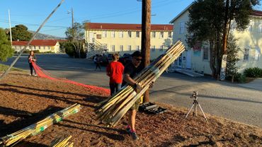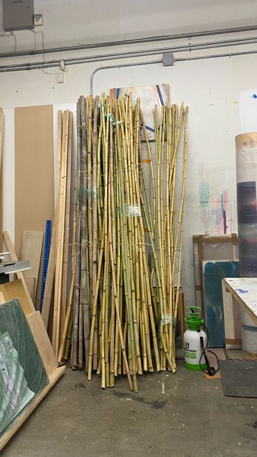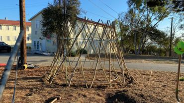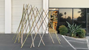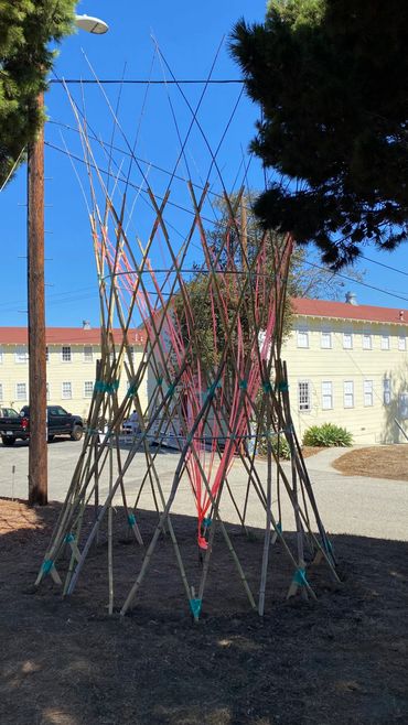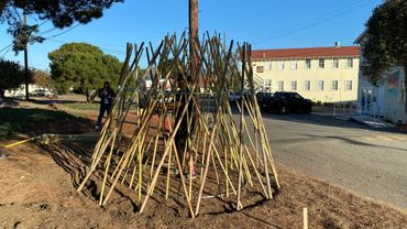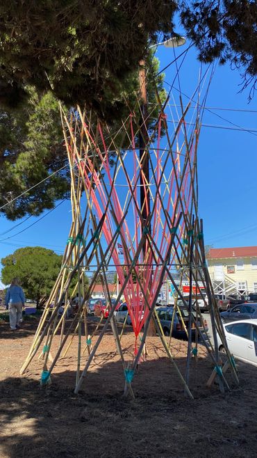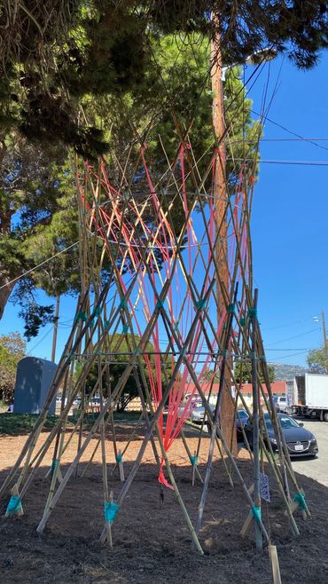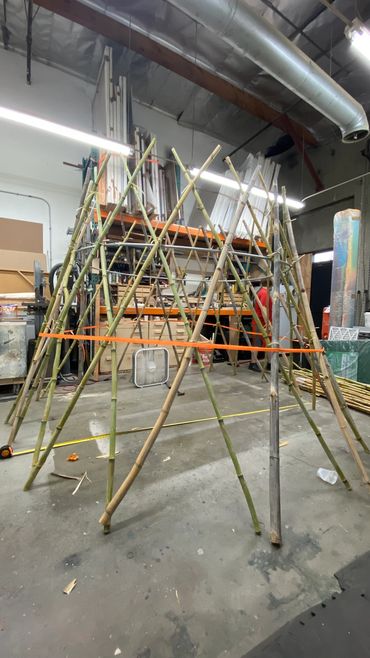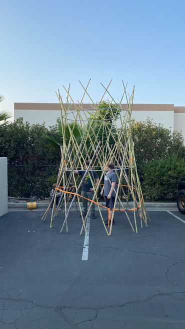 The tower is constructed from locally sourced, wild bamboo that was harvested by Mark & Chet in a Riverside, CA tributary. Other materials include readily available items from various merchants. The effectiveness of the tower is a mystery to us. We'll find out.